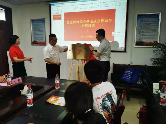 儀式現(xiàn)場(chǎng),佳先股份副總經(jīng)理、工會(huì)主席丁柱介紹了公司發(fā)展及參與公益事業(yè)的情況;區(qū)委常委、常務(wù)副區(qū)長(zhǎng)程旭和佳先股份董事長(zhǎng)李兌共同為“佳先股份愛心基金”揭牌;佳先股份愛心基金向沫河口鎮(zhèn)學(xué)生捐贈(zèng)10萬元。